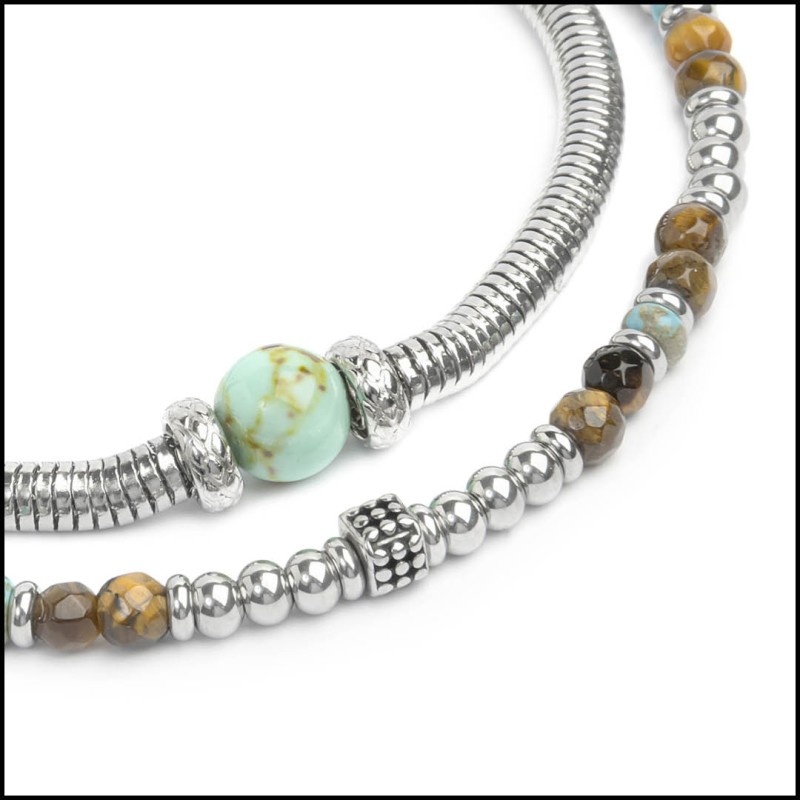 Bracciale in acciaio con pietra composita marrone occhio di tigre sfacettata, pietra composita azzurro turchese, elementi in acciaio e con elemento centrale in acciaio bugnato. Lunghezza bracciale 21 cm, regolabile da 19 a 21 cm tramite tag Marlù removibile.